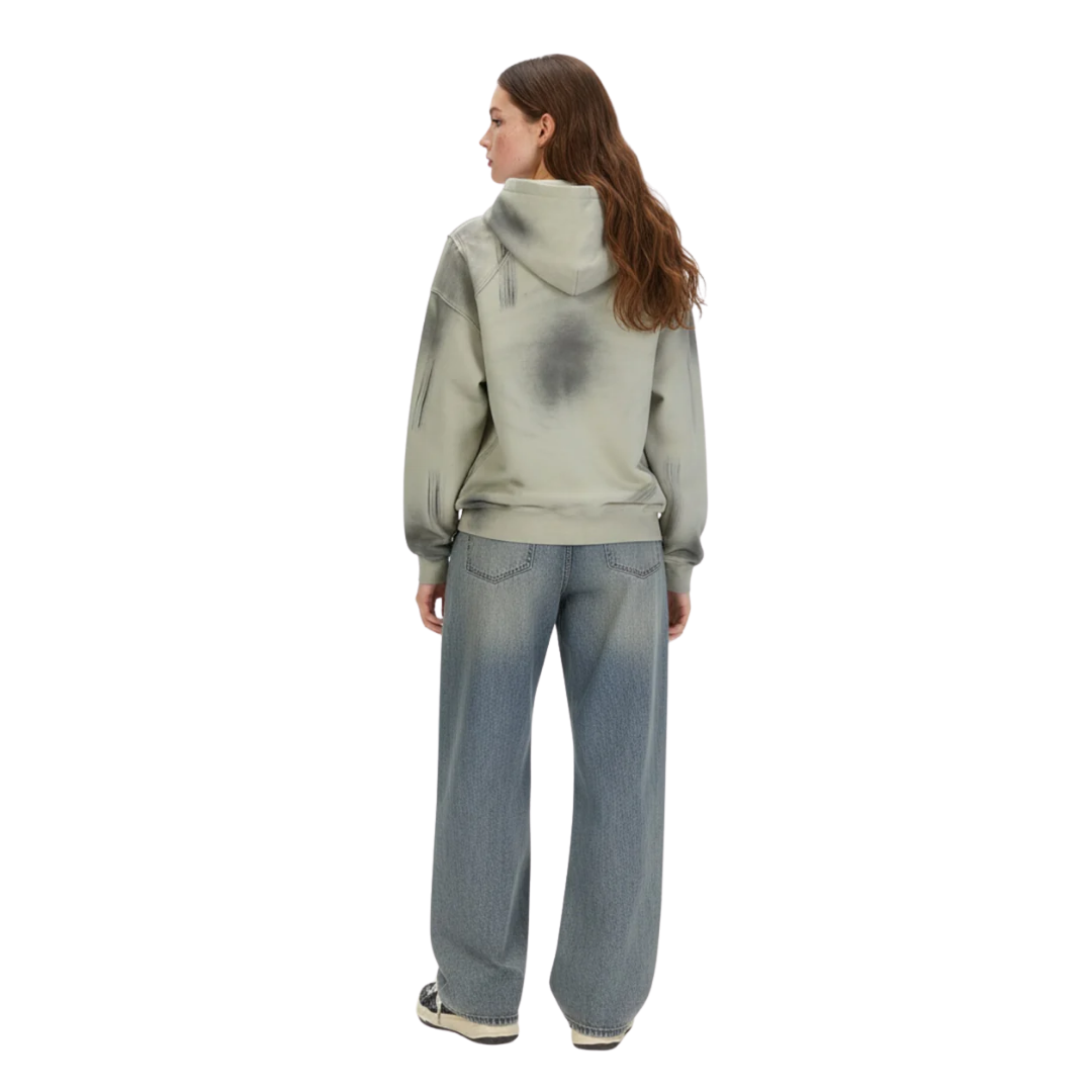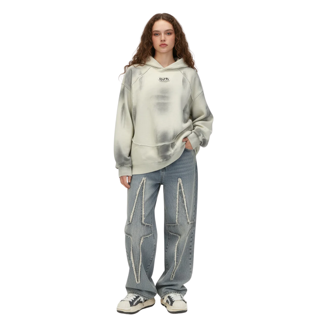 Gri taş yıkama dokusu ve çarpraz panel efektli büyük star detaylarıyla Layered Panel Denim, denim stiline heykelsi bir hava katıyor. Katmanlı dikişler ve keskin konturlar, klasik wide-leg silüeti modern bir statement parçaya dönüştürüyor.