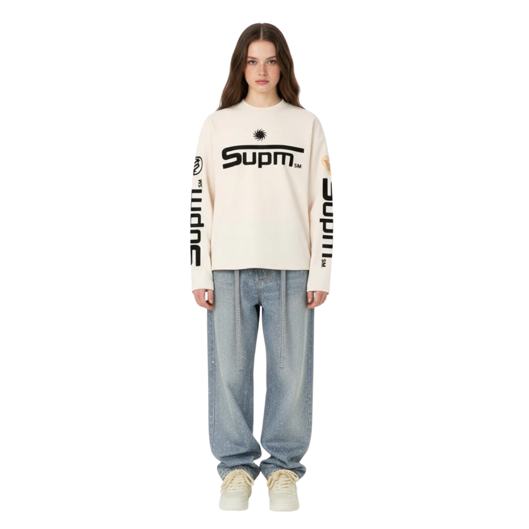 Işıltılı taş detayları ve degrade denim dokusuyla Rhinestone Chain Jeans, klasik wide-fit denim silüetini parıltılı ve modern bir görünüme taşıyor. Zincir görünümlü uzun bel bağcıkları ve alt kısımdaki birikme efektiyle hem cool hem de iddialı bir tarz sunuyor.