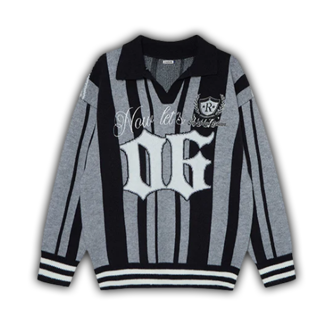 Retro çizgiler + koleji andıran grafikler — preppy streetwear’ın ikonik knit parçası. Limitli stokta! 💙🏉✨